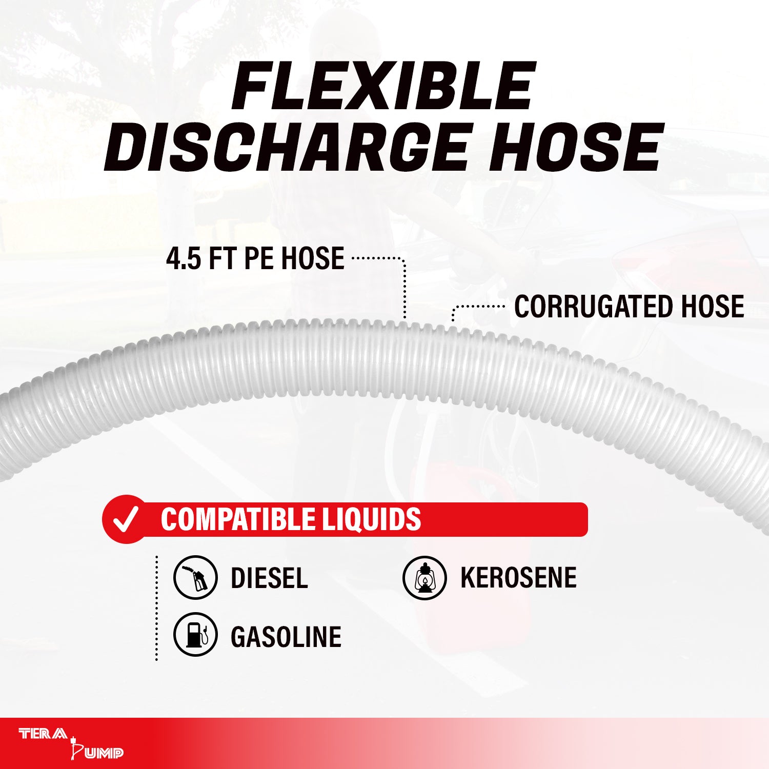 - A 54" corrugated outtake hose makes it easy to transfer fuel from a distance, eliminating the need for holding up heavy fuel cans.